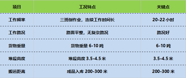 企業(yè)的產(chǎn)品種類繁多,在貨物搬運中,工況場景主要特點是工作時間長、貨物重、堆垛高